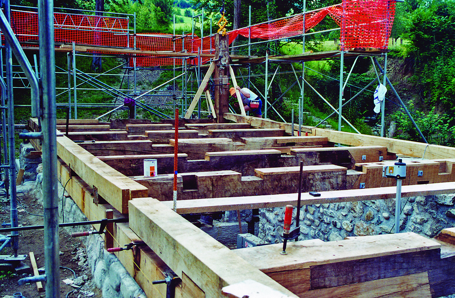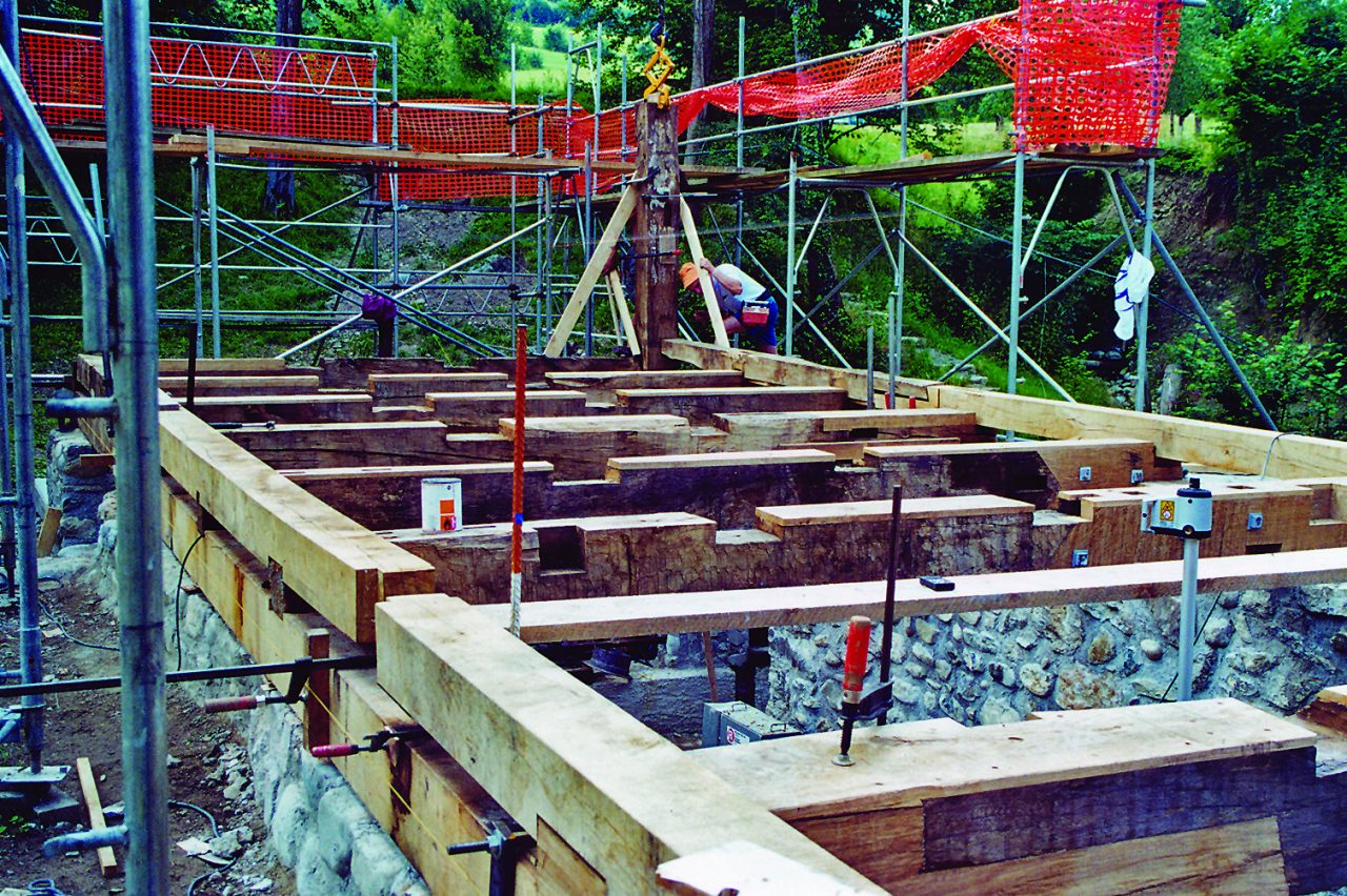 Anschließend folgte der Einbau des neuen Wasserrades und des Kammrades. Für die in den 30er Jahren bei der Demontage des letzten Wasserrades verloren gegangenen Transmissionsteile durften aus der nicht mehr in Betrieb stehenden Säge von Frau J. Frey in Mühlau verschiedene Bestandteile ausgebaut und verwendet werden. Andere Teile mussten neu angefertigt werden, so auch der Klotzwagen mit der Holzverzahnung und der Unterbau der Wagenfräse.