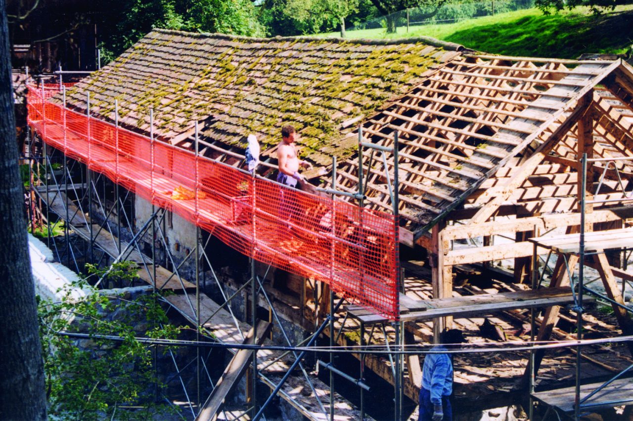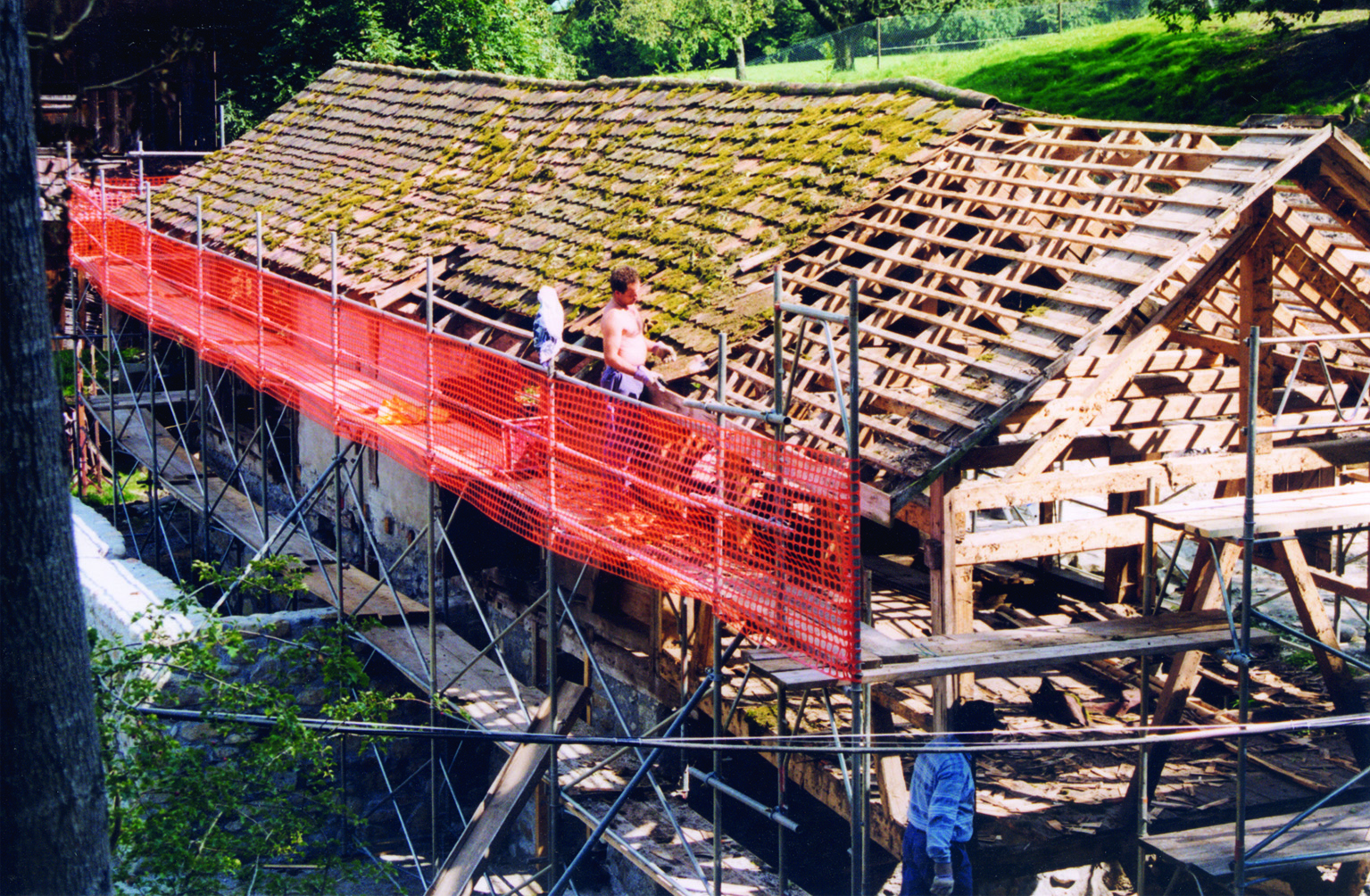 Im Frühjahr 1998 begannen die Bauarbeiten mit der Sanierung des Wasserwerkes, der Freilegung des ehemaligen Wasserradschachtes und mit der Reparatur der Francis Turbine in der Lehrlingswerkstatt der ABB in Birr. Gleichzeitig wurde das Projekt für die Restaurierung des Gebäudes ausgearbeitet. Im Juli 1999 konnte mit der Demontage des Oberbaus begonnen werden. Der Holzbau wurde in der Zimmereiwerkstatt restauriert, fehlende Teile ersetzt und anschliessend wieder aufgebaut. Im gleichen Zug wurde das Mauerwerk aus dem 15. Jahrhundert renoviert.